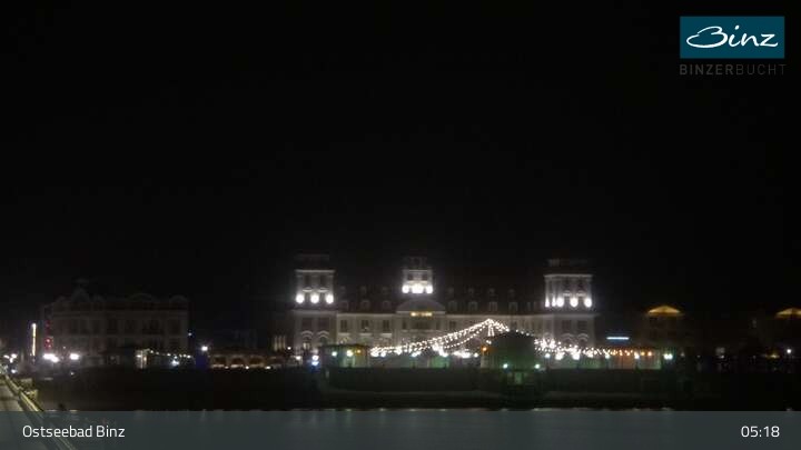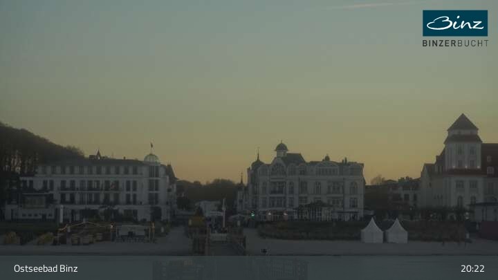 Zu sehen ist die Strandpromenade des Ostseebades Binz. Die Webcam ist auf der Seebrücke Binz positioniert und zeigt unter anderem Kurhaus, Strandpromenade und den Fischerstrand.