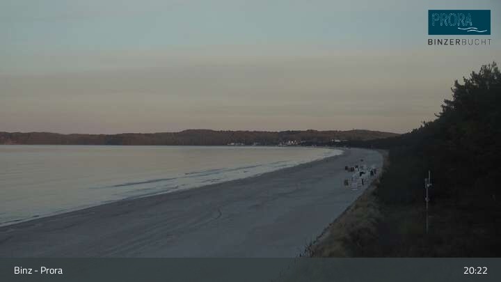Die Kamera befindet sich auf der Insel Rügen am Strand von Prora und blickt über die Binzer Bucht.