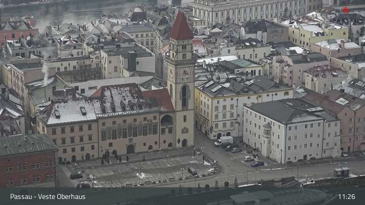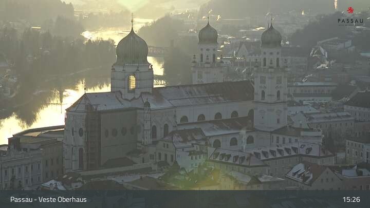 Die Webcam zeigt dir den Blick von der Veste Oberhaus über die Donau zur Altstadt der niederbayerischen Stadt Passau. Sehr gut zu erkennen sind links Teile der Burgveste, die Ortspitze wo die drei Flüsse Donau, Inn und Ilz zusammenfließen, die Hängebrücke über die Donau und rechts der weiße Stephansdom.