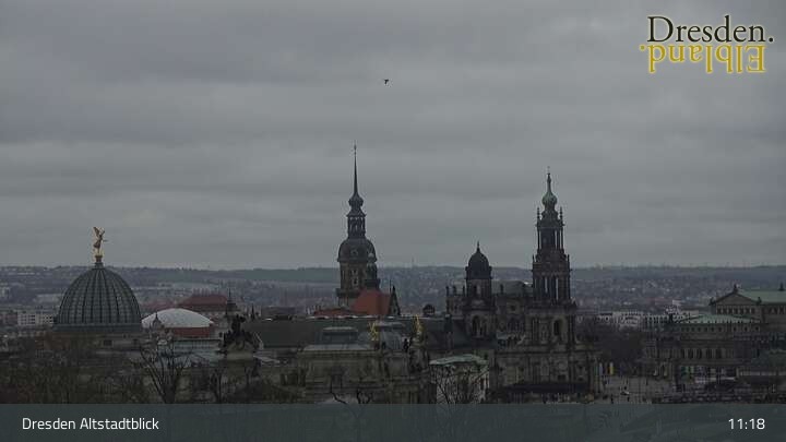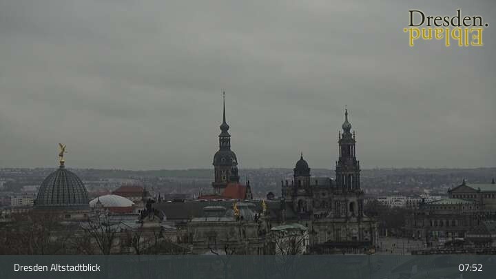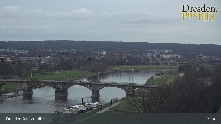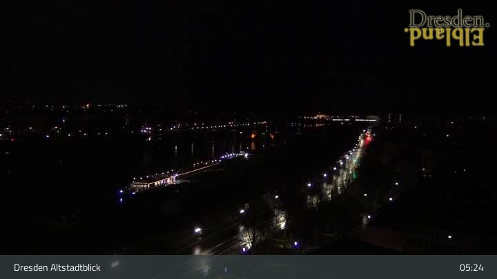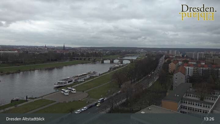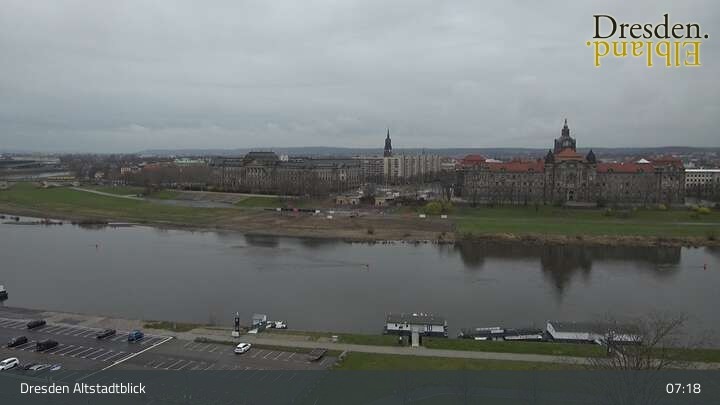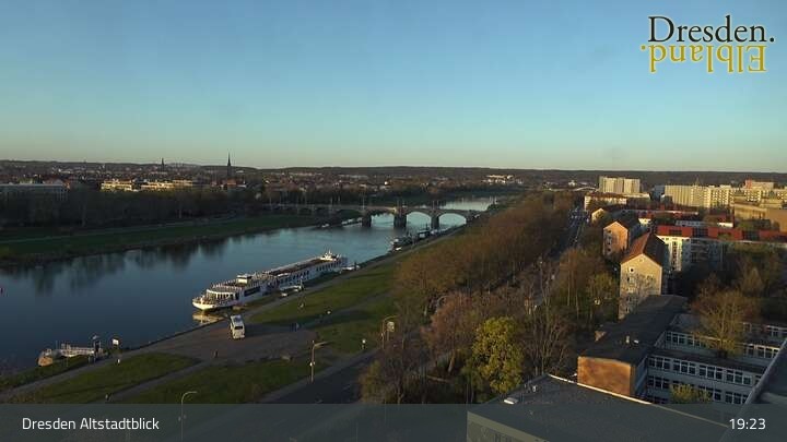 Die Kamera befindet sich am Hotel am Terrassenufer in Dresden und blickt auf die Altstadt und die Elbe.