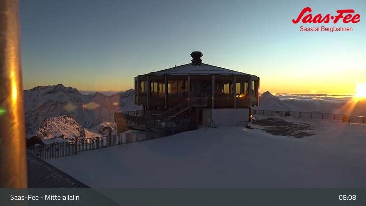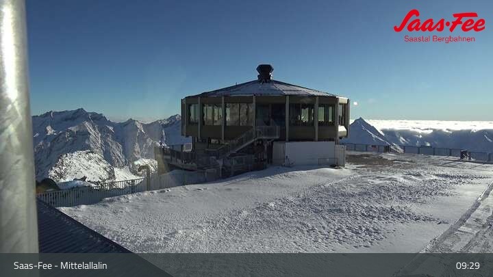 Diese Webcam auf dem Mittelallalin, einem Nebengipfel des Allalinhorns in Saas-Fee zeigt das Drehrestaurant, von dem aus man die Aussicht auf die umliegenden Walliser Alpen genießen kann.