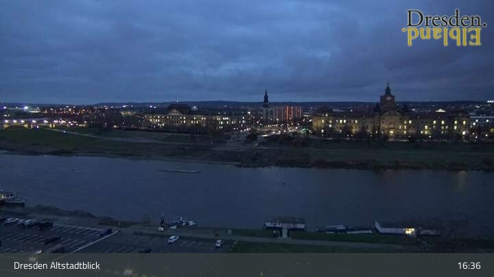 Die Kamera befindet sich am Hotel am Terrassenufer in Dresden und blickt auf die Altstadt und die Elbe.