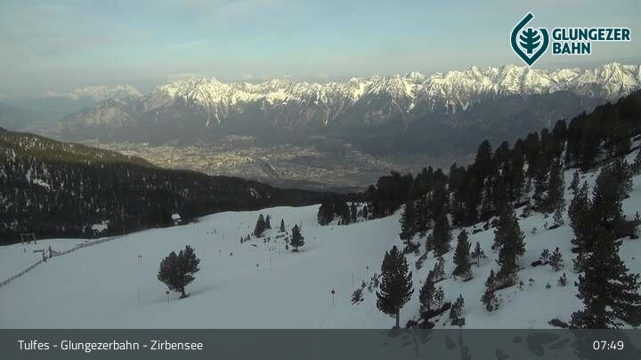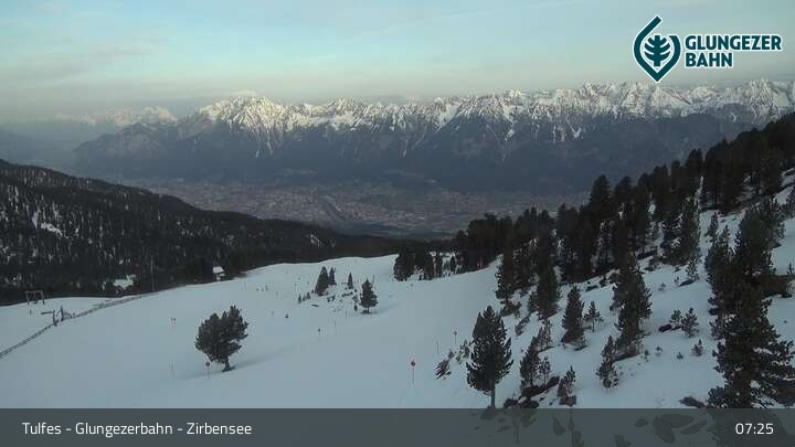 Die Webcam ermöglicht einen tollen Panoramablick auf die Landschaft am Glungezer. Das Bild wird unweit des Zirbensees aufgenommen.