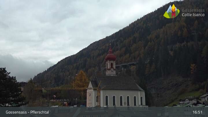 Die Kamera zeigt die Kirche Parrocchia San Valentino in Gossensass im Eisacktal.