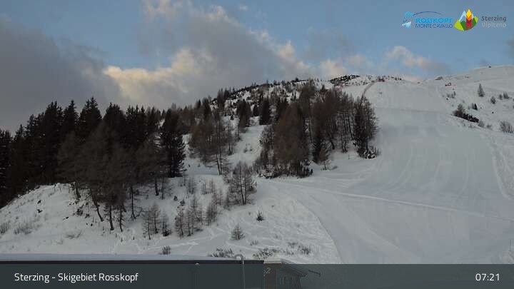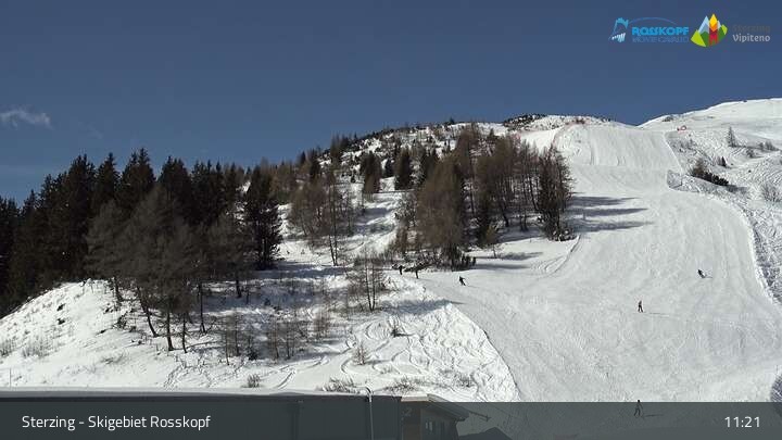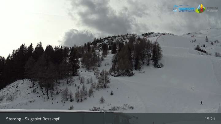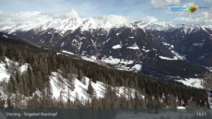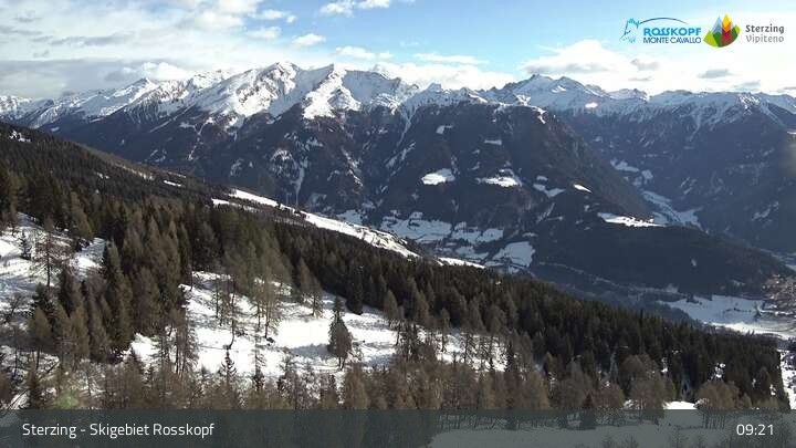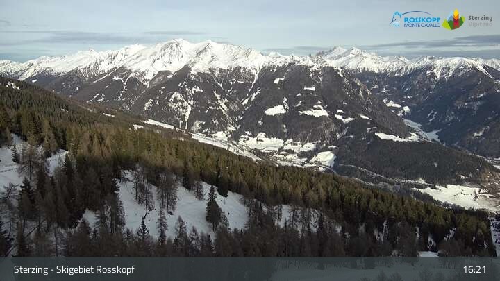 Die Kamera steht an der Bergstation der Seilbahn am Rosskopf und zeigt die Stubaier Alpen.
