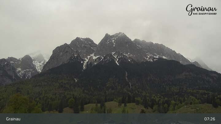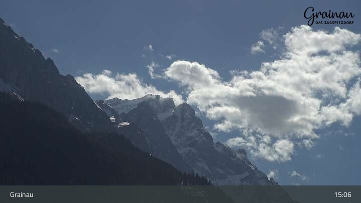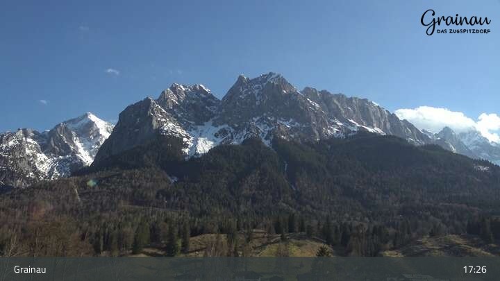 Die Live-Webcam zeigt vom Freibad aus einen Rundumblick auf das Bergdorf Grainau und seine Umgebung. Zu sehen sind unter anderem die Zugspitze, der große und kleine Waxenstein sowie der Hohe Ziegspitz.