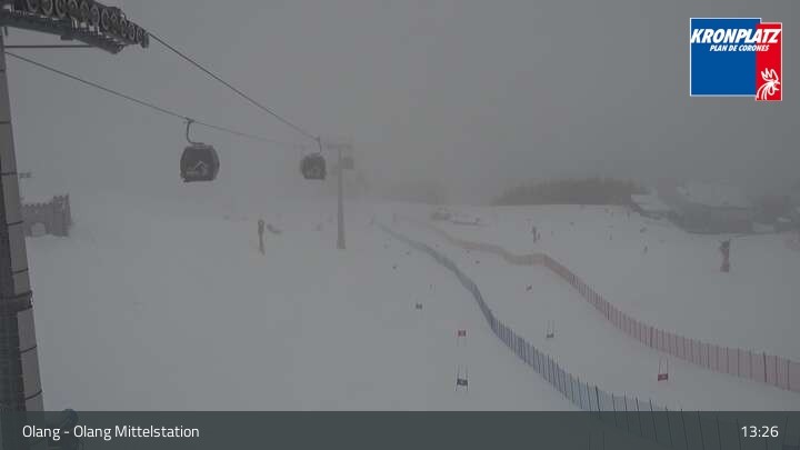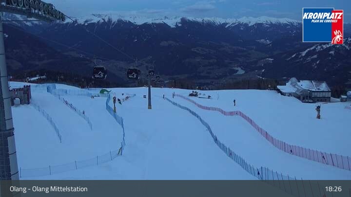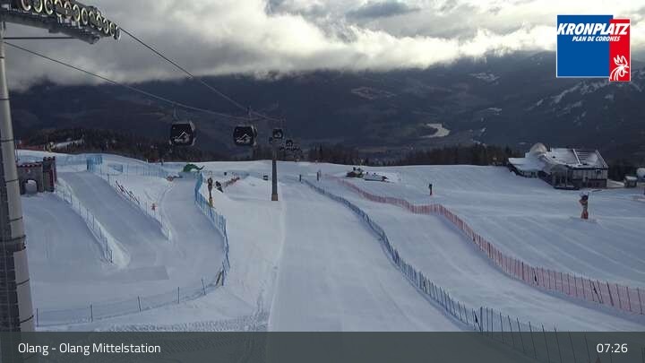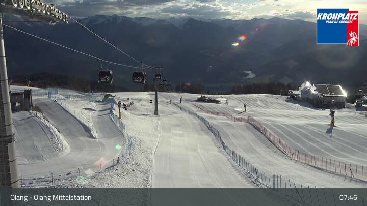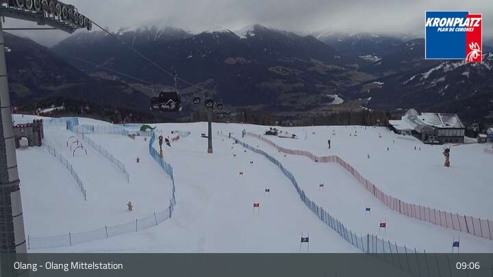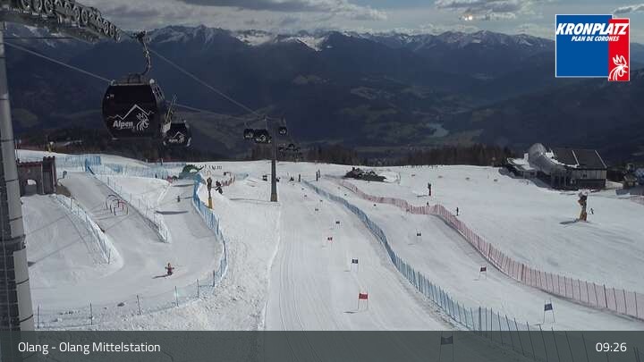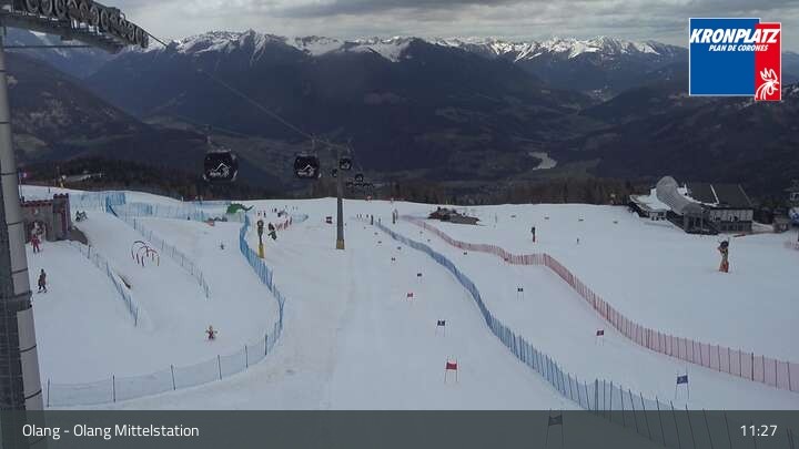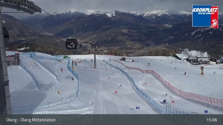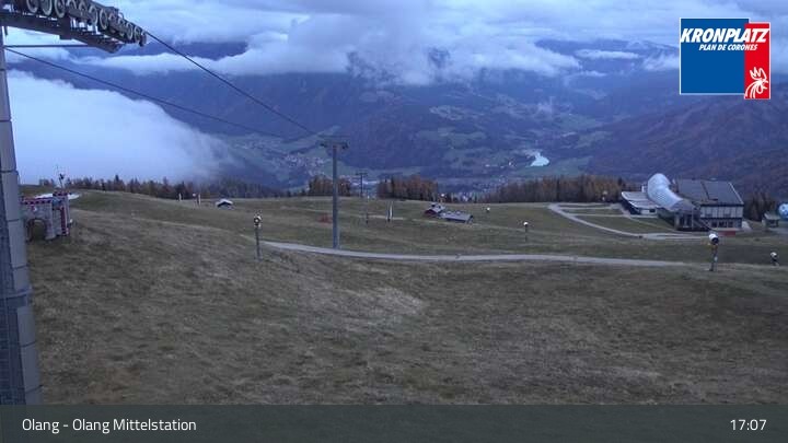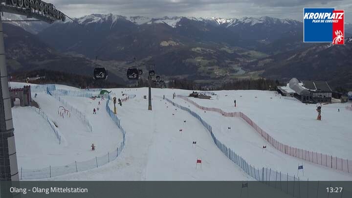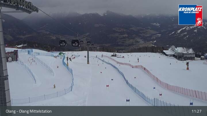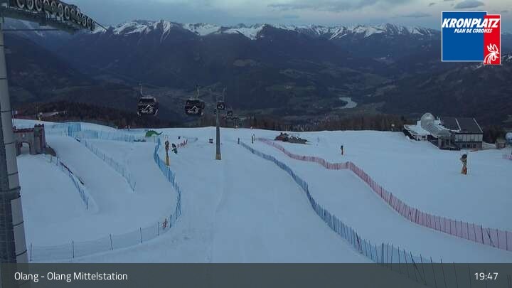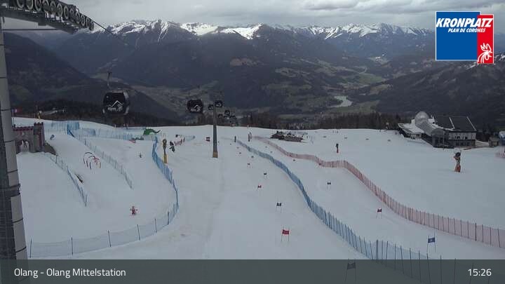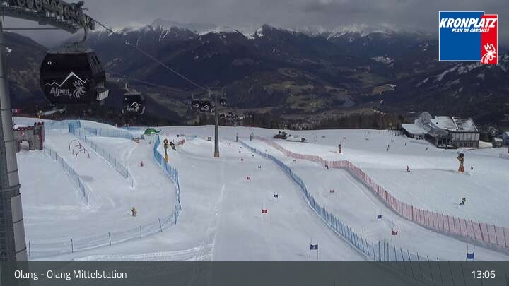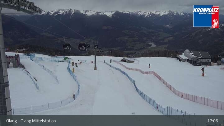 Hier siehst du die Mittelstation der Gondel Olang sowie die umliegende Bergwelt von Kronplatz.
