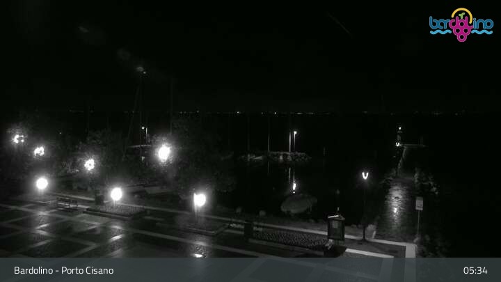 Die Kamera befindet sich am Strand Lido Mirabello und blickt nach Norden auf den Hafen von Bardolino am Gardasee.