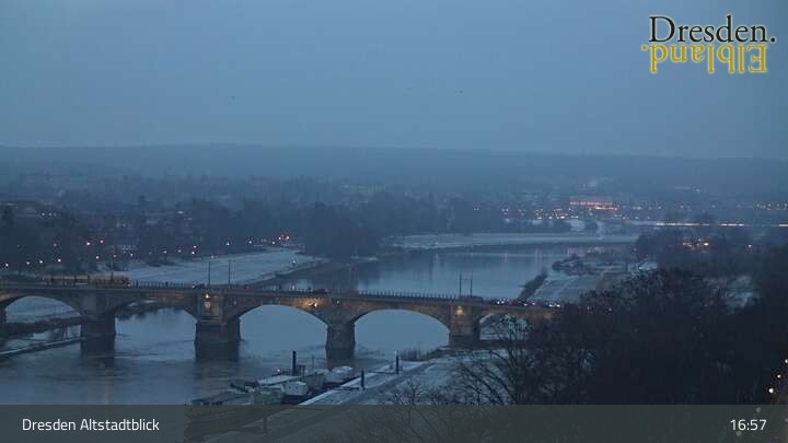 Die Kamera befindet sich am Hotel am Terrassenufer in Dresden und blickt auf die Altstadt und die Elbe.