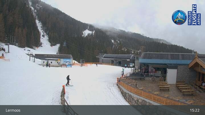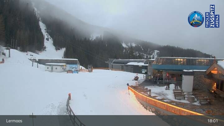 Die Webcam befindet sich an der Bergstation des Hochmoos Express in Lermoos und blickt auf die umliegenden Alpen.