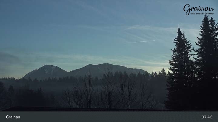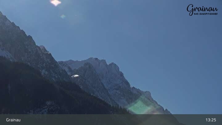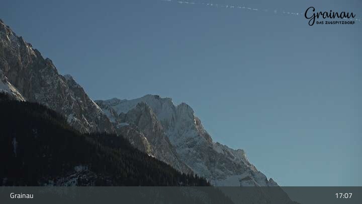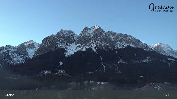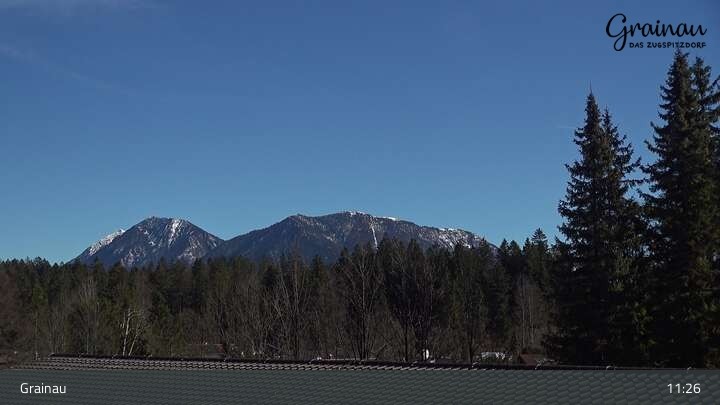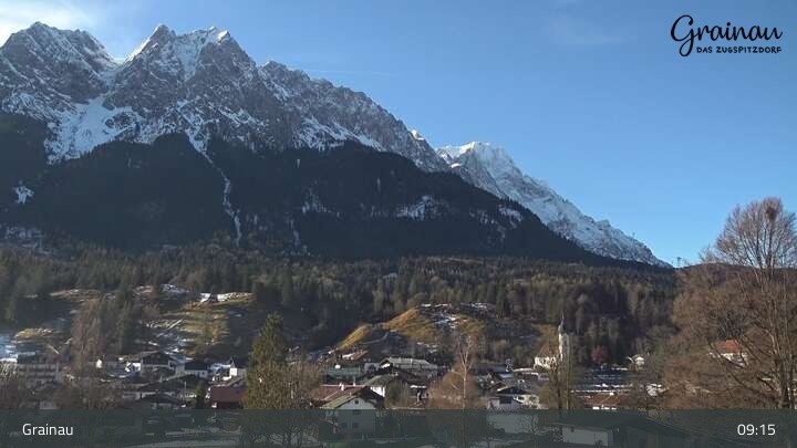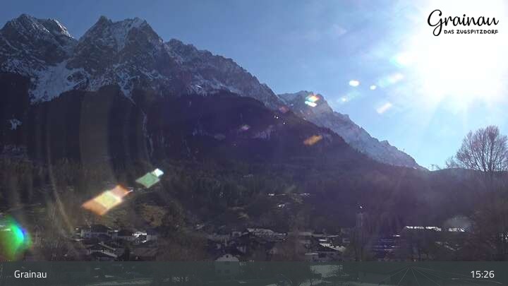 Die Live-Webcam zeigt vom Freibad aus einen Rundumblick auf das Bergdorf Grainau und seine Umgebung. Zu sehen sind unter anderem die Zugspitze, der große und kleine Waxenstein sowie der Hohe Ziegspitz.