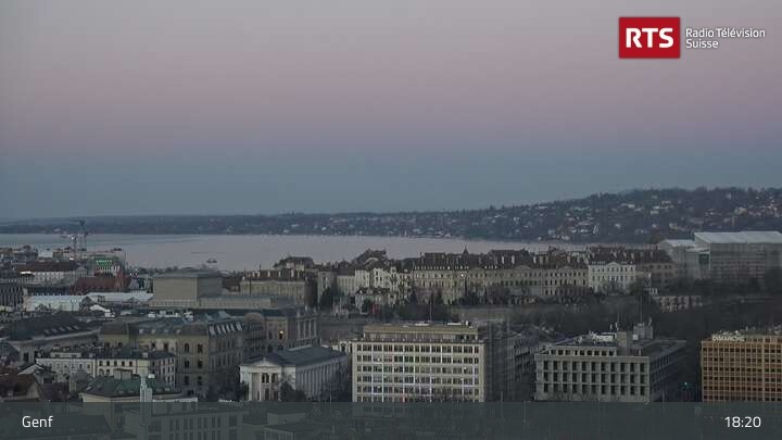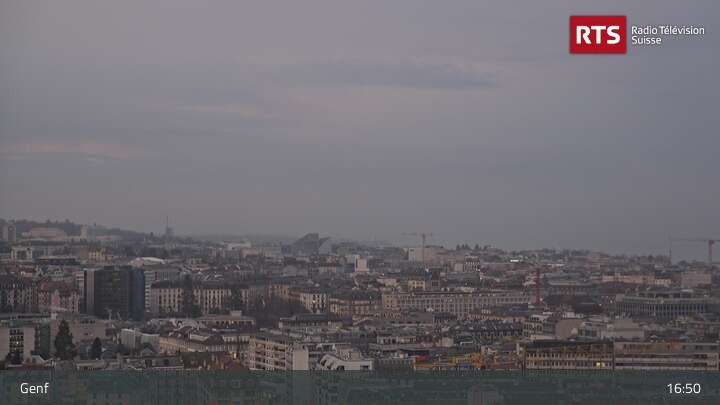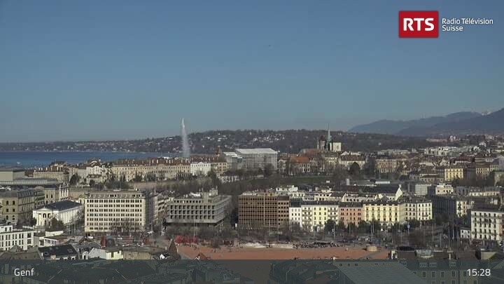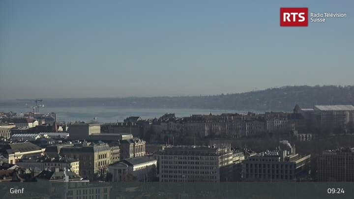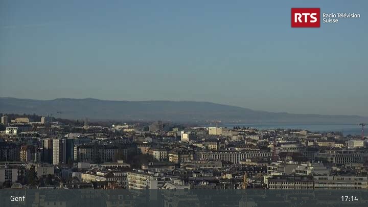 Hier siehst du den Blick vom RTS (Radio Télévision Suisse) Hochhaus in der Schweizer Stadt Genf.