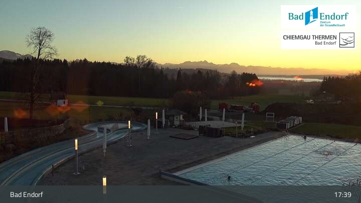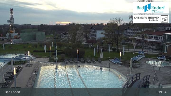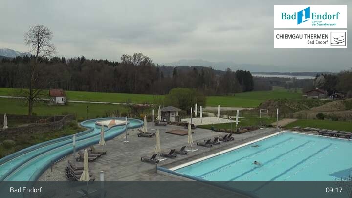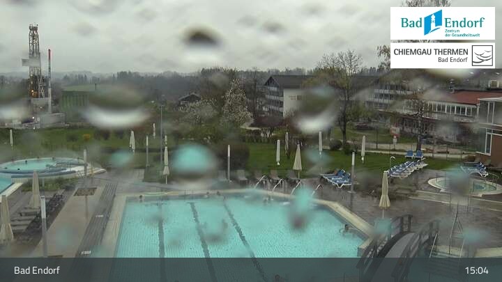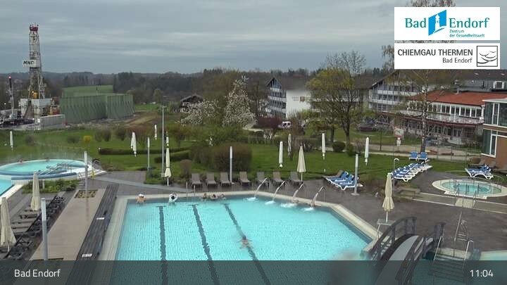 Die Webcam bietet einen Blick das Außengelände der Chiemgau Therme in Bad Endorf. Zu sehen ist unter anderem auch der 125 Meter lange Strömungskanal, ein Highlight der Therme im Landkreis Rosenheim.