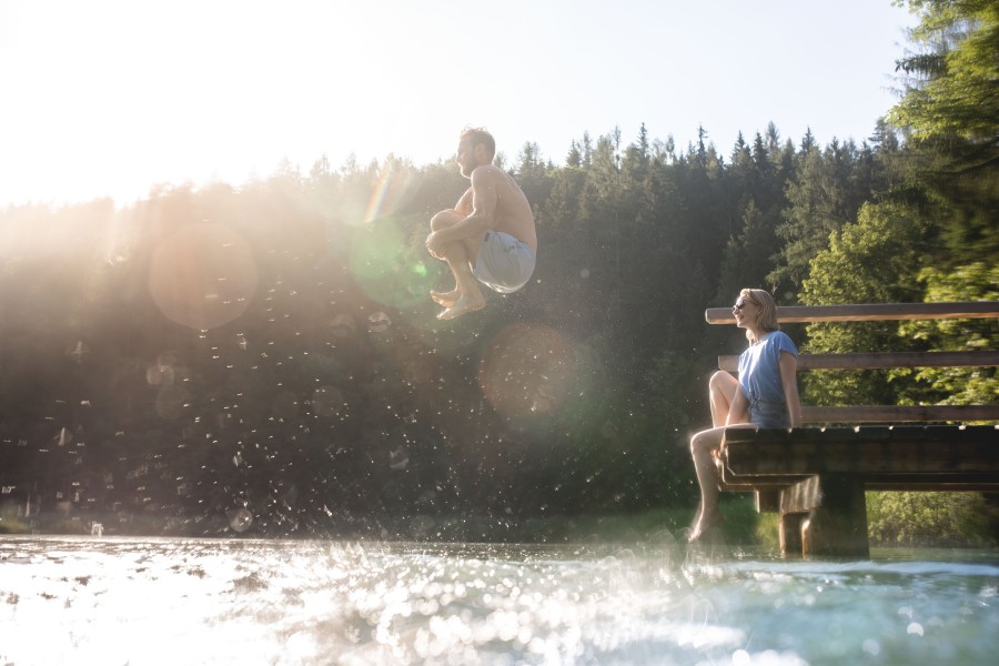 Ein Badesteg und eine Liegewiese laden im Sommer zum Schwimmen und Sonnenbaden ein. Das naturbelassene Gewässer ist frei zugänglich und bietet weder Chlor noch Beton – dafür klares Wasser, Schilfgürtel und Ruhe. Wer nicht ins Wasser möchte, lässt sich einfach auf einer der Parkbänke am Ufer nieder und genießt den Blick über den Teich.