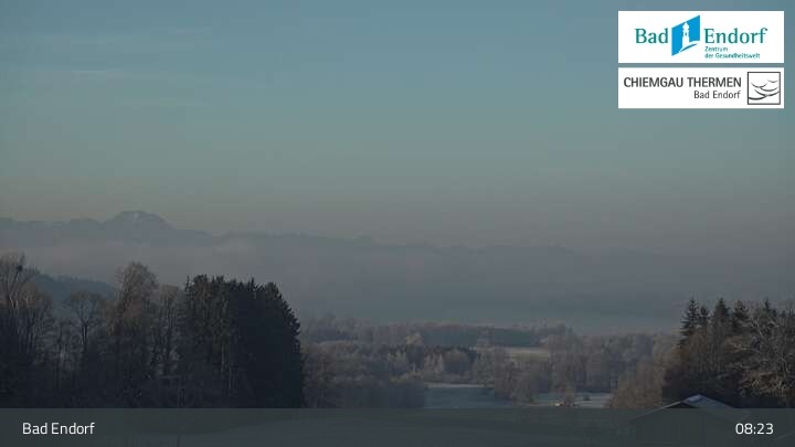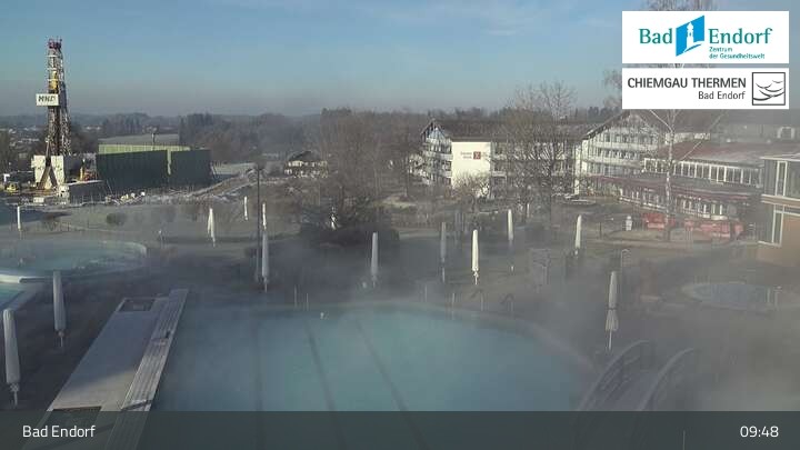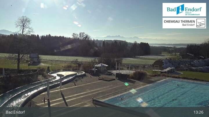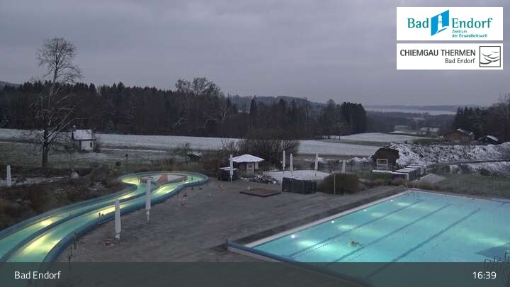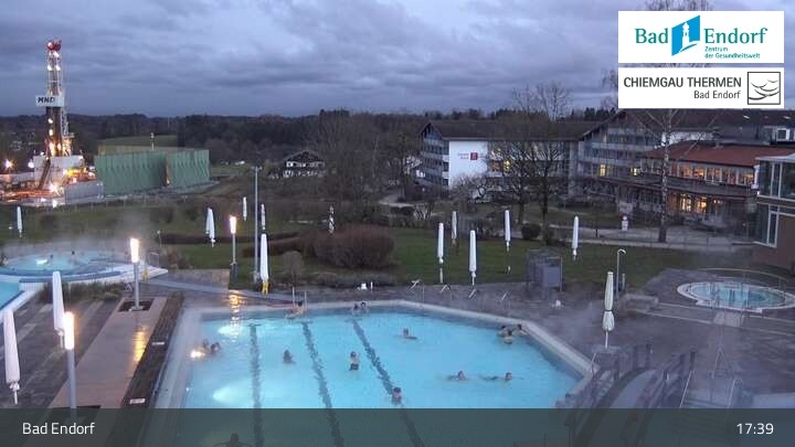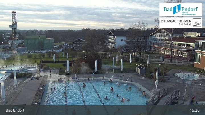 Die Webcam bietet einen Blick das Außengelände der Chiemgau Therme in Bad Endorf. Zu sehen ist unter anderem auch der 125 Meter lange Strömungskanal, ein Highlight der Therme im Landkreis Rosenheim.