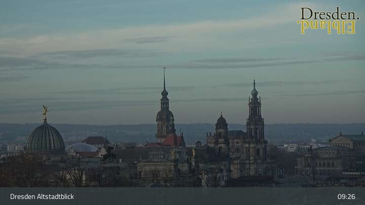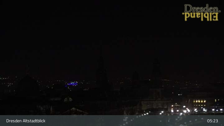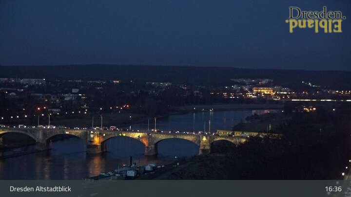 Die Kamera befindet sich am Hotel am Terrassenufer in Dresden und blickt auf die Altstadt und die Elbe.