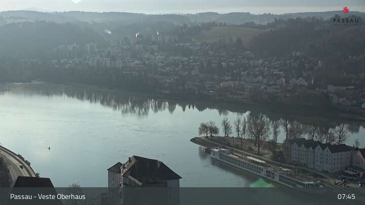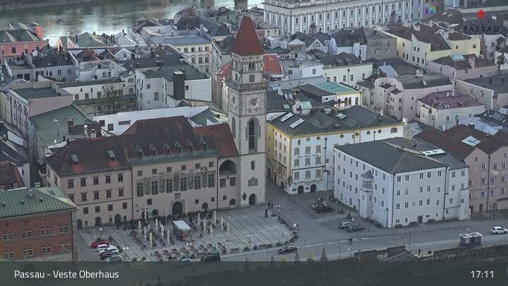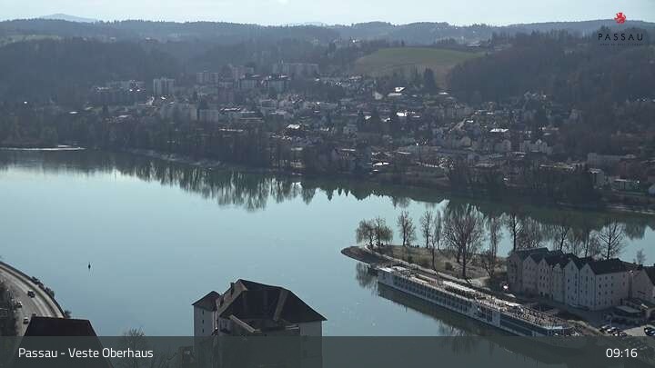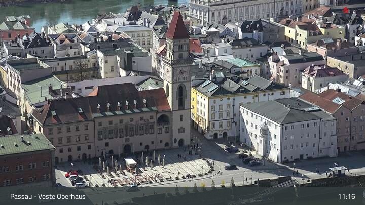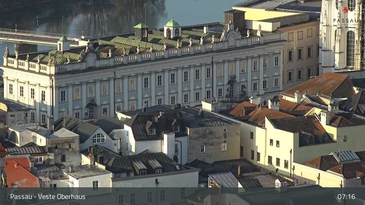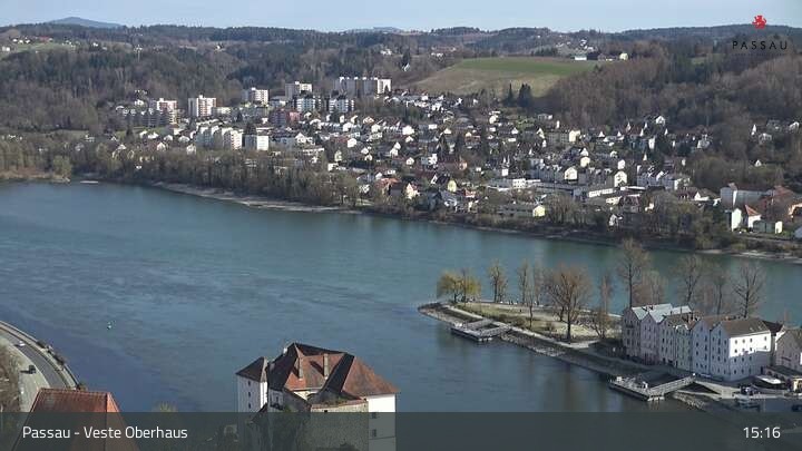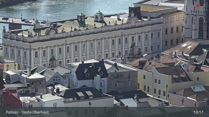 Die Webcam zeigt dir den Blick von der Veste Oberhaus über die Donau zur Altstadt der niederbayerischen Stadt Passau. Sehr gut zu erkennen sind links Teile der Burgveste, die Ortspitze wo die drei Flüsse Donau, Inn und Ilz zusammenfließen, die Hängebrücke über die Donau und rechts der weiße Stephansdom.
