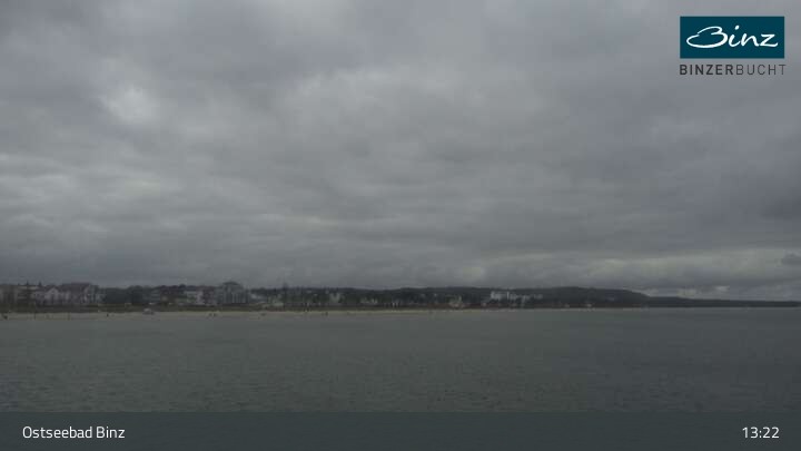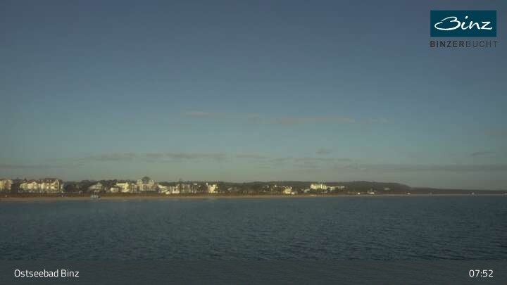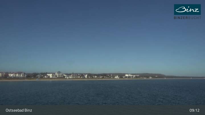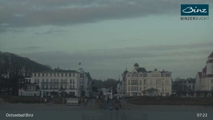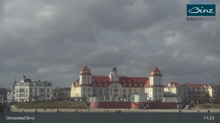 Zu sehen ist die Strandpromenade des Ostseebades Binz. Die Webcam ist auf der Seebrücke Binz positioniert und zeigt unter anderem Kurhaus, Strandpromenade und den Fischerstrand.