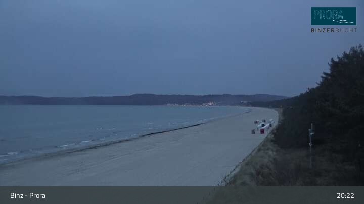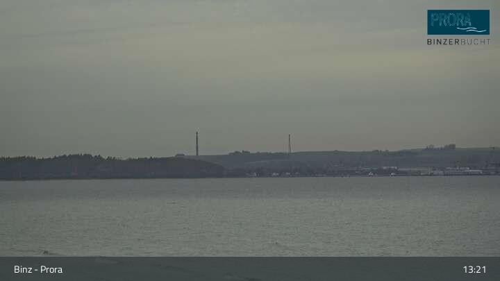 Die Kamera befindet sich auf der Insel Rügen am Strand von Prora und blickt über die Binzer Bucht.