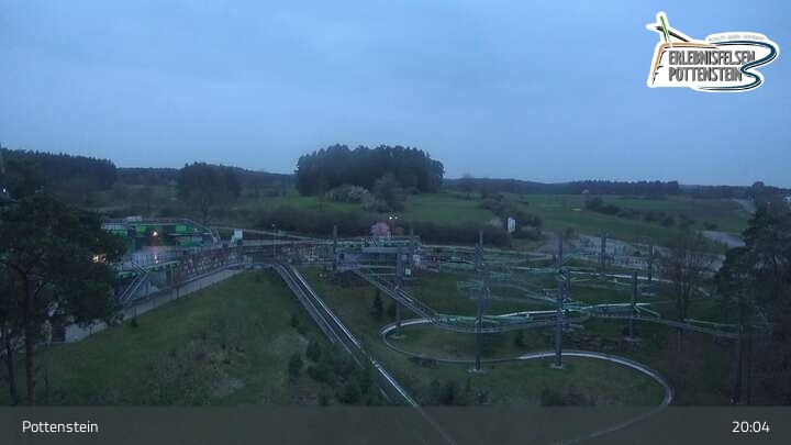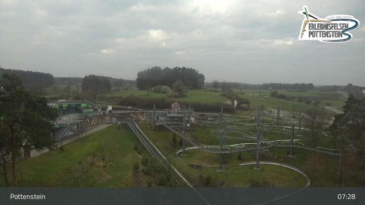 Toller Panoramablick auf den Erlebnisfelsen Pottenstein und seine Attraktionen. Es gibt dort zwei Rodelbahnen, den Hexenbesen als eine Art Achterbahn, einen Skywalk und eine Trampolinanlage.