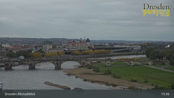 Die Kamera befindet sich am Hotel am Terrassenufer in Dresden und blickt auf die Altstadt und die Elbe.