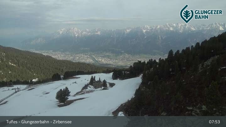 Die Webcam ermöglicht einen tollen Panoramablick auf die Landschaft am Glungezer. Das Bild wird unweit des Zirbensees aufgenommen.