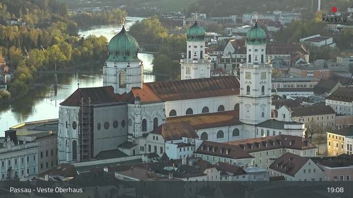 Die Webcam zeigt dir den Blick von der Veste Oberhaus über die Donau zur Altstadt der niederbayerischen Stadt Passau. Sehr gut zu erkennen sind links Teile der Burgveste, die Ortspitze wo die drei Flüsse Donau, Inn und Ilz zusammenfließen, die Hängebrücke über die Donau und rechts der weiße Stephansdom.