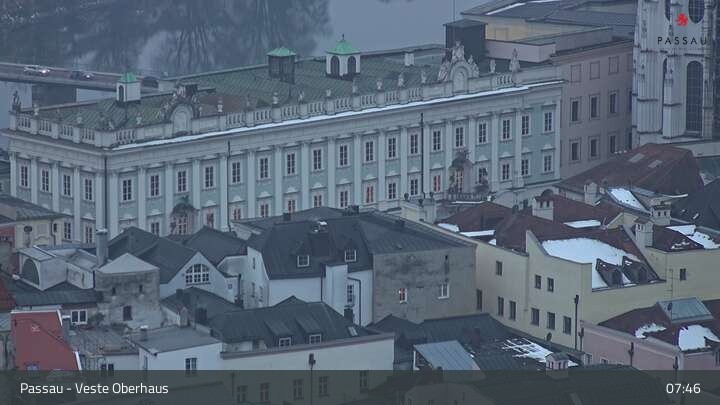 Die Webcam zeigt dir den Blick von der Veste Oberhaus über die Donau zur Altstadt der niederbayerischen Stadt Passau. Sehr gut zu erkennen sind links Teile der Burgveste, die Ortspitze wo die drei Flüsse Donau, Inn und Ilz zusammenfließen, die Hängebrücke über die Donau und rechts der weiße Stephansdom.