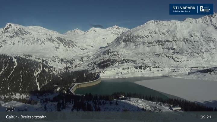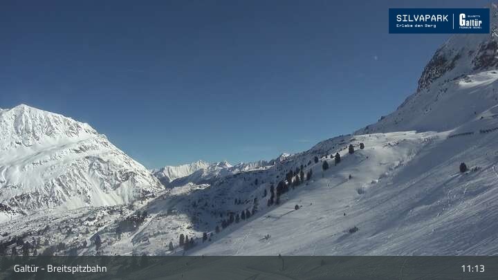 Die Webcam an der Breitspitzbahn in Galtür blickt auf die umliegende Bergwelt.