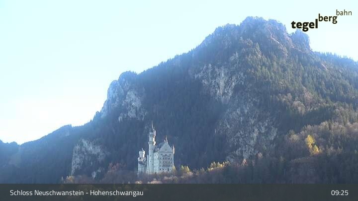 Die Kamera befindet sich am Schloss Hohenschwangau und schwenkt vom Schloss Neuschwanstein zum Museum der Bayerischen Könige.