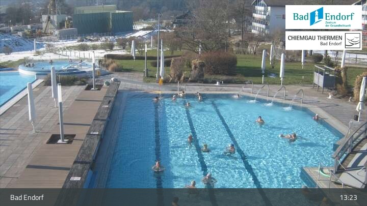 Hier sieht man einen Teil der Außenbecken der beliebten Chiemgau Therme in Bad Endorf im Landkreis Rosenheim.
