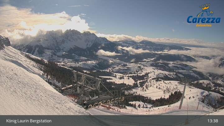 Die Webcam eröffnet von der Kölner Hütte das Panorama zum Latemar. Du siehst hier auch gut die neue König Laurin Gondelbahn mit unterirdischer Bergstation.
