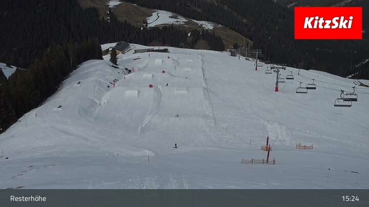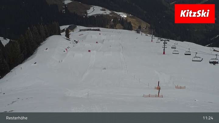 Hier blickst du von der Hangalm auf den Snowpark des Skigebiets Kitzbühel