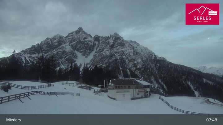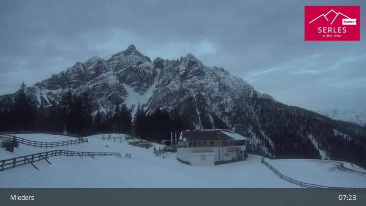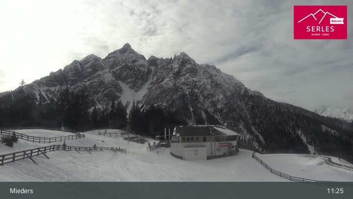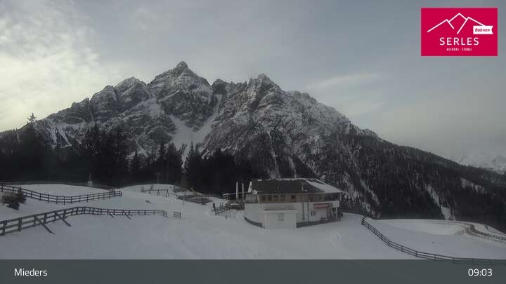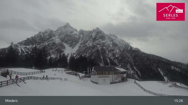 Die Webcam eröffnet den Blick von der Bergstation Koppeneck auf den Hausberg von Mieders, die Serles. Zu sehen sind außerdem das Bergrestaurant Koppeneck mit Kinderspielplatz und der Speichersee.