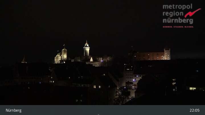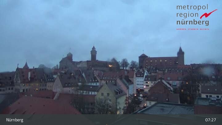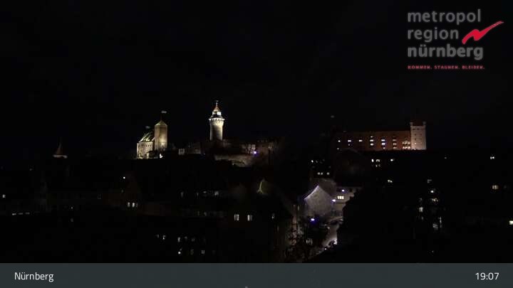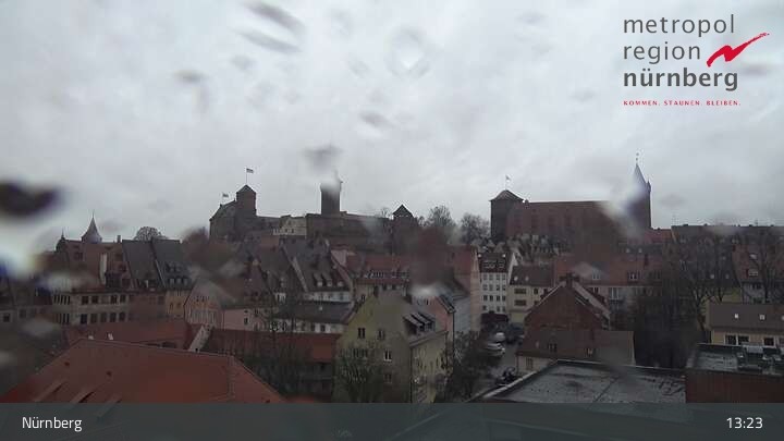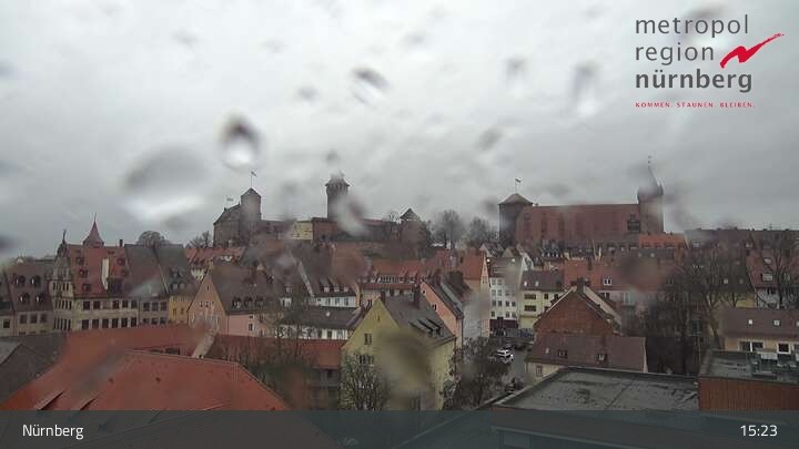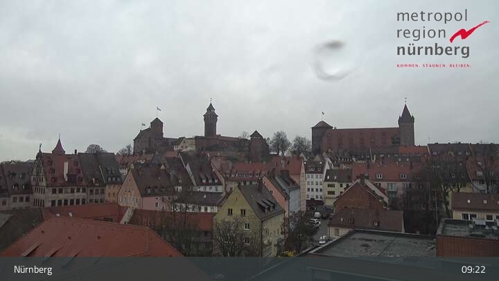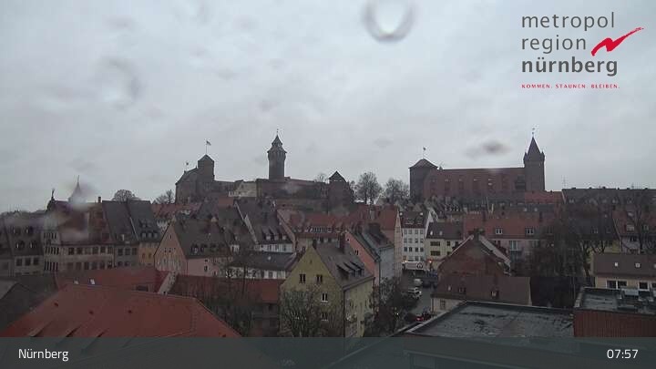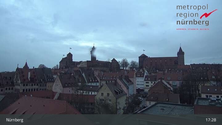 Blick über die Dächer Nürnbergs, die zweitgrößte Stadt Bayerns. Die Kamera ist in der Theresienstraße in der Altstadt positioniert und zeigt unter anderem die Kaiserburg, das Rathaus und das Staatstheater.