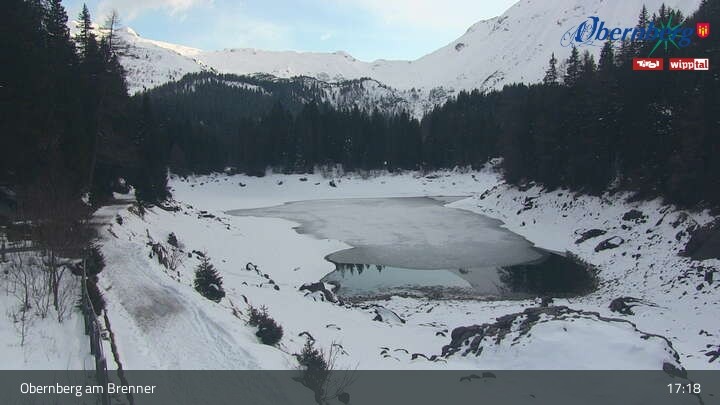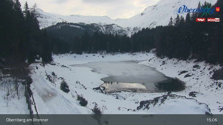Die Kamera blickt auf den Obernberger See am Brenner.
