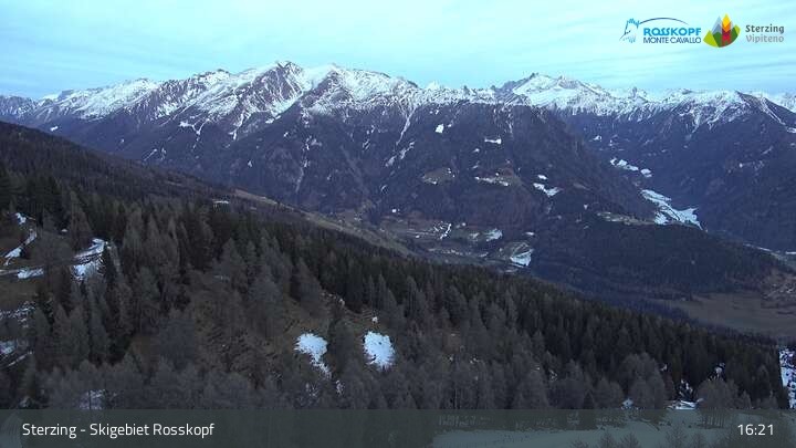 Die Kamera steht an der Bergstation der Seilbahn am Rosskopf und zeigt die Stubaier Alpen.