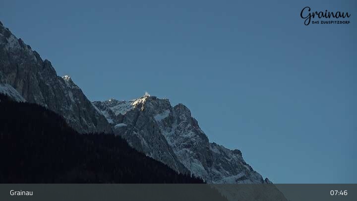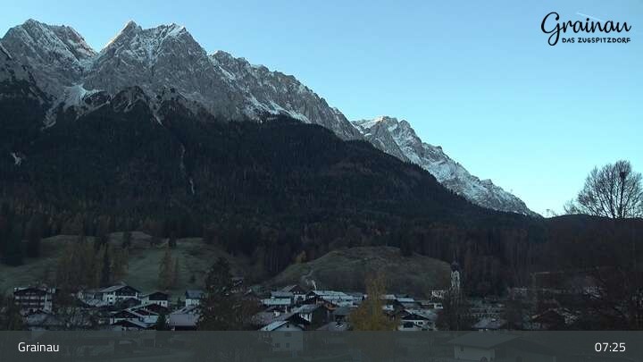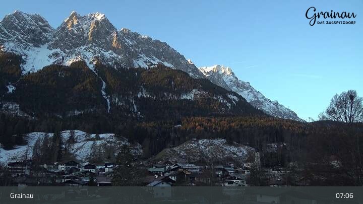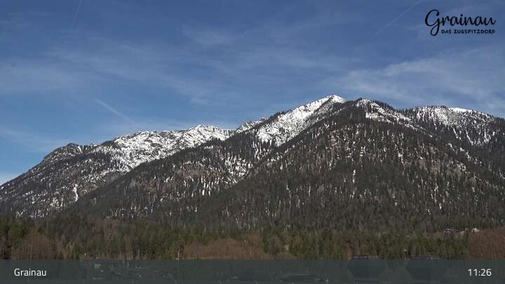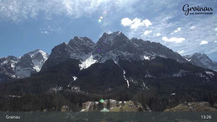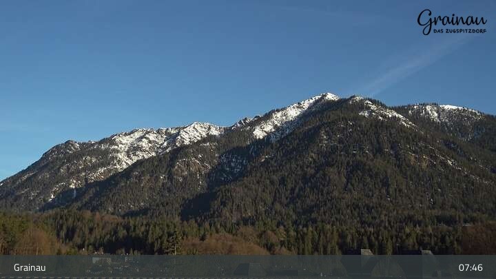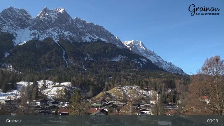 Die Live-Webcam zeigt vom Freibad aus einen Rundumblick auf das Bergdorf Grainau und seine Umgebung. Zu sehen sind unter anderem die Zugspitze, der große und kleine Waxenstein sowie der Hohe Ziegspitz.
