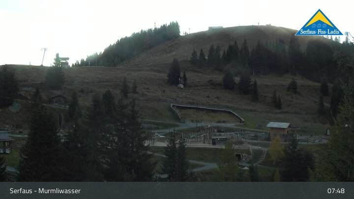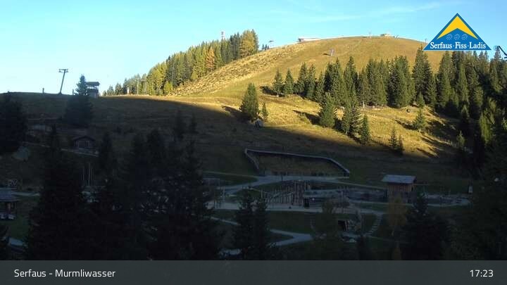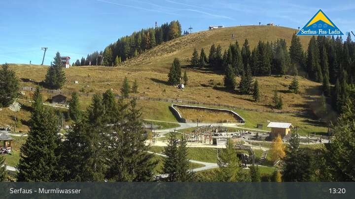 Blick auf das Serfauser Murmliwasser, ein 15.000 Quadratmeter großer Spielpark unterhalb der Mittelstation der Komperdellbahn. Der Park hat vom Frühsommer bis zum ersten Schnee im Spätherbst geöffnet.