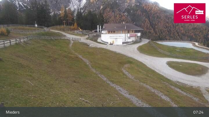 Die Webcam eröffnet den Blick von der Bergstation Koppeneck auf den Hausberg von Mieders, die Serles. Zu sehen sind außerdem das Bergrestaurant Koppeneck mit Kinderspielplatz und der Speichersee.