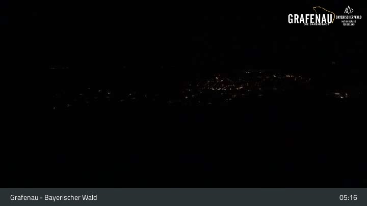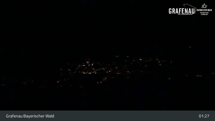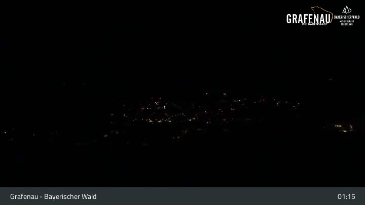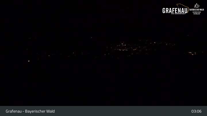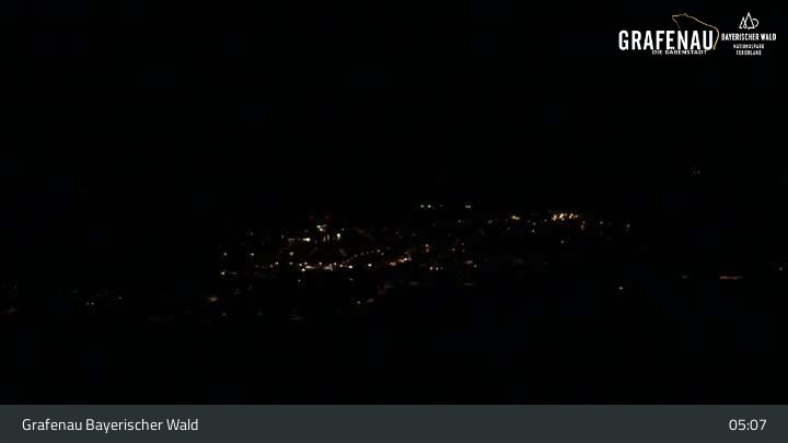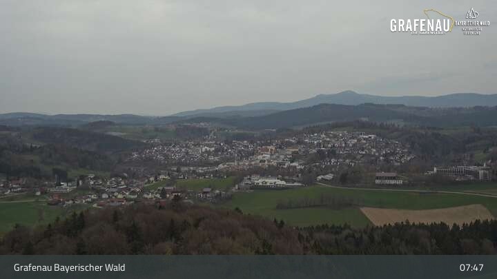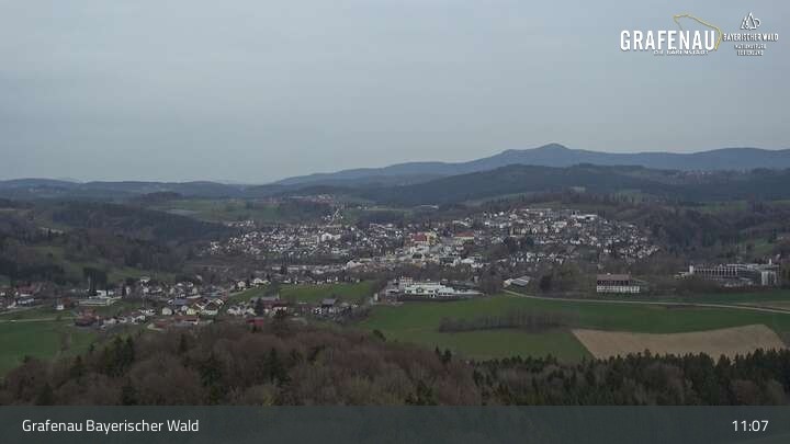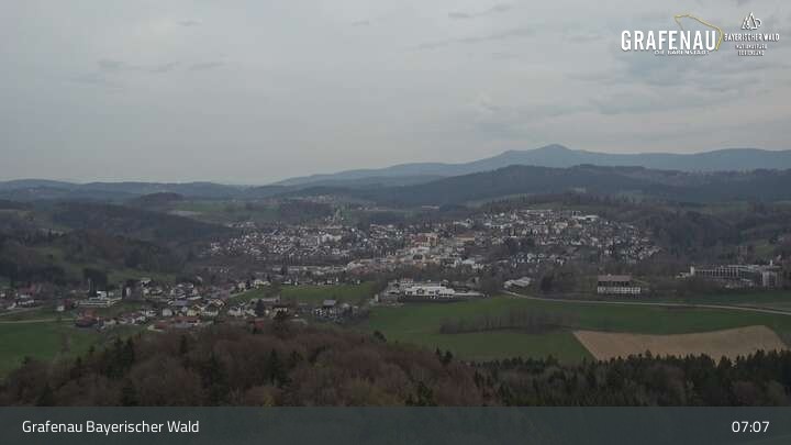 Genieße den Ausblick auf den Luftkurort Grafenau im Bayerischen Wald. Die Kamera befindet sich südlich der Stadt und blickt nach Norden über die Stadt zum Nationalpark Bayerischer Wald.