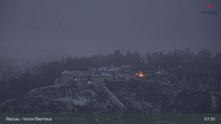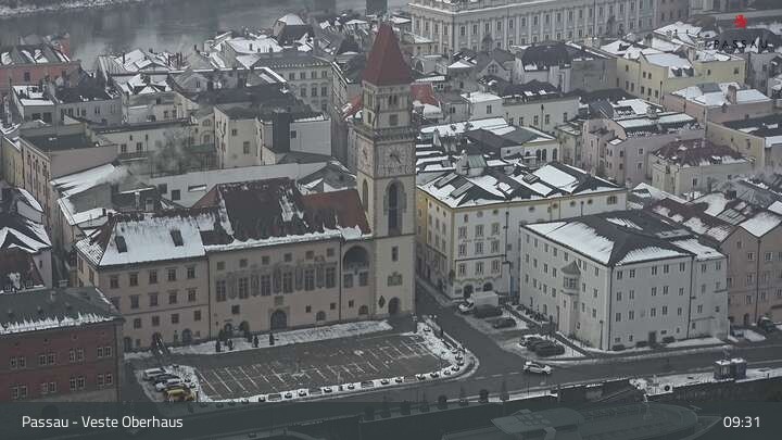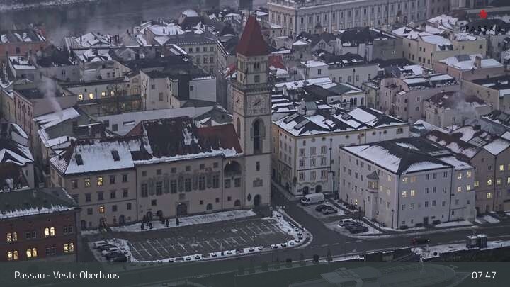 Die Webcam zeigt dir den Blick von der Veste Oberhaus über die Donau zur Altstadt der niederbayerischen Stadt Passau. Sehr gut zu erkennen sind links Teile der Burgveste, die Ortspitze wo die drei Flüsse Donau, Inn und Ilz zusammenfließen, die Hängebrücke über die Donau und rechts der weiße Stephansdom.