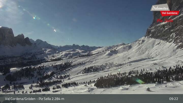 Ausblick von der Bergstation am Piz Sella in Val Gardena in Südirol. Zu sehen sind u.a. der Langkofel und die Sellagrupee.