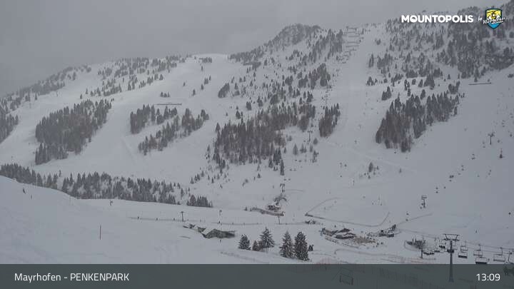 Hier blickst du auf den Vans Penken Park sowie den Sun-Jet Lift im Skigebiet Mayrhofen.