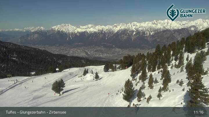 Die Webcam ermöglicht einen tollen Panoramablick auf die Landschaft am Glungezer. Das Bild wird unweit des Zirbensees aufgenommen.
