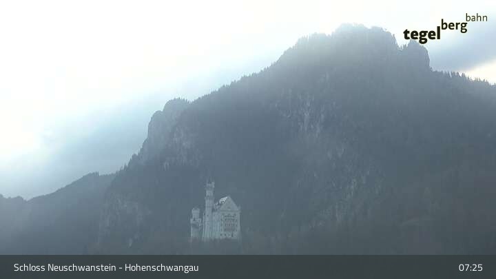 Die Kamera befindet sich am Schloss Hohenschwangau und schwenkt vom Schloss Neuschwanstein zum Museum der Bayerischen Könige.