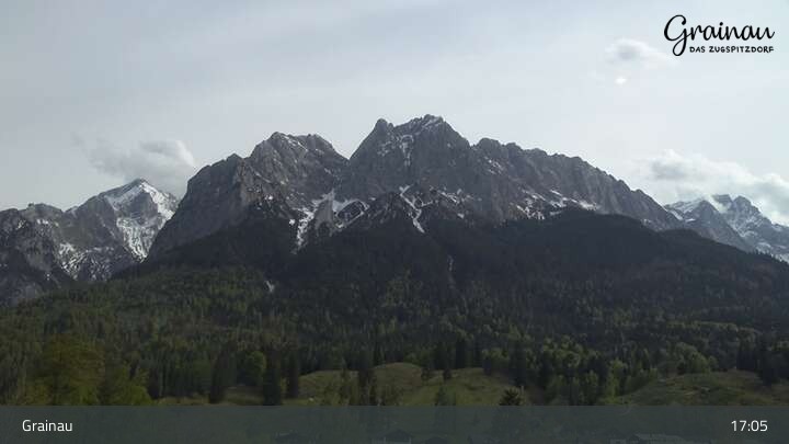Die Live-Webcam zeigt vom Freibad aus einen Rundumblick auf das Bergdorf Grainau und seine Umgebung. Zu sehen sind unter anderem die Zugspitze, der große und kleine Waxenstein sowie der Hohe Ziegspitz.
