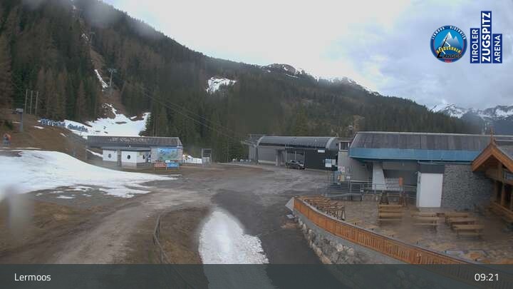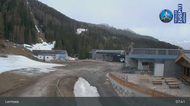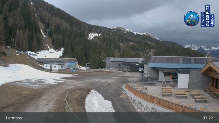 Die Webcam befindet sich an der Bergstation des Hochmoos Express in Lermoos und blickt auf die umliegenden Alpen.