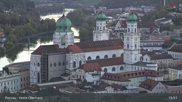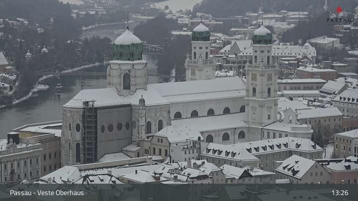 Die Webcam zeigt dir den Blick von der Veste Oberhaus über die Donau zur Altstadt der niederbayerischen Stadt Passau. Sehr gut zu erkennen sind links Teile der Burgveste, die Ortspitze wo die drei Flüsse Donau, Inn und Ilz zusammenfließen, die Hängebrücke über die Donau und rechts der weiße Stephansdom.