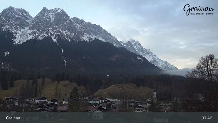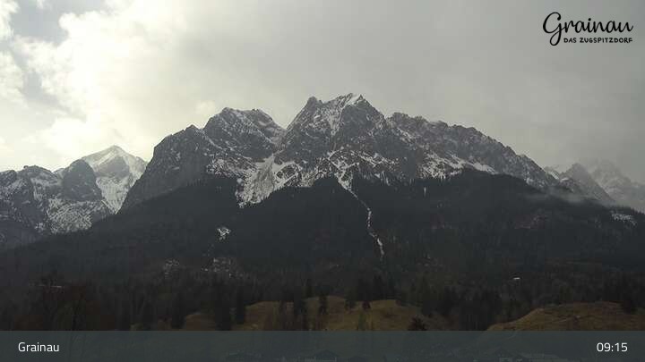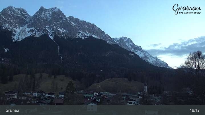 Die Live-Webcam zeigt vom Freibad aus einen Rundumblick auf das Bergdorf Grainau und seine Umgebung. Zu sehen sind unter anderem die Zugspitze, der große und kleine Waxenstein sowie der Hohe Ziegspitz.